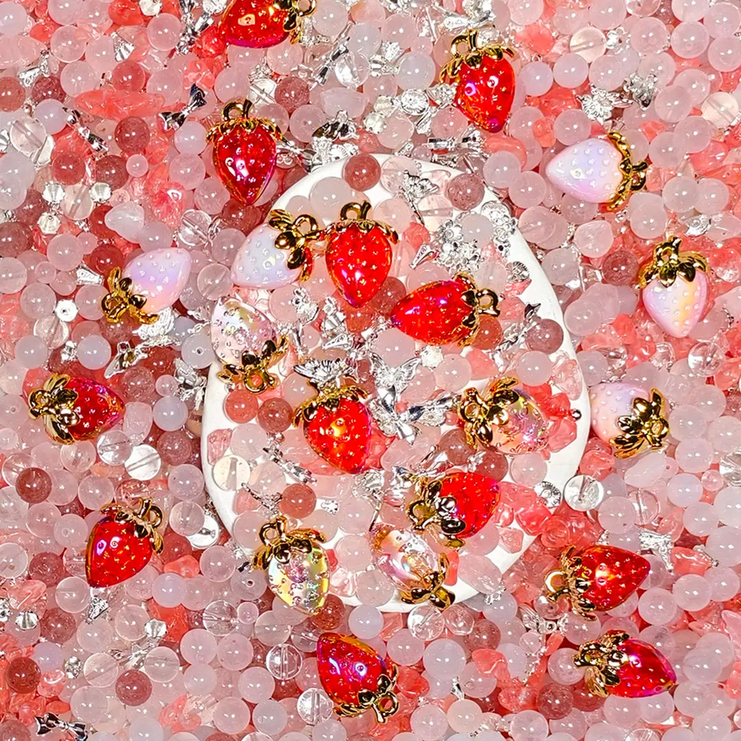 • Design: Mixed-bead necklace with varied sizes and soft pink tones, accented by a sparkling strawberry charm. Ideal for DIY into bracelets, hairpins, or bag charms.