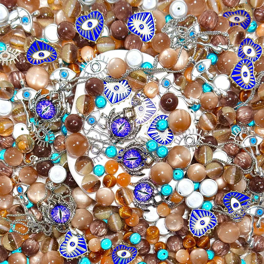 • Material: The violet eye is precision-cast in glass or resin, capturing the depth and luminosity of a real iris. It is set within an intricately framed alloy bezel, surrounded by translucent blue acrylic and warm brown resin beads that echo the rays of divine light.