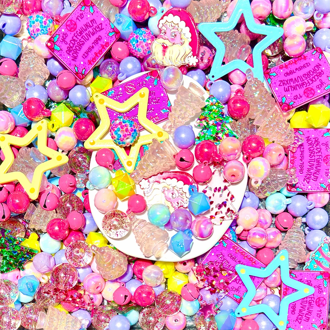• Color: Centered on vintage pop color blocking: Light blue + neon yellow glow-in-the-dark pentagrams are the visual focus, paired with pink-purple gradient, rose pink, and light purple pearlized beads, interspersed with clear glitter balls. The overall look features vintage candy tones with soft saturation.