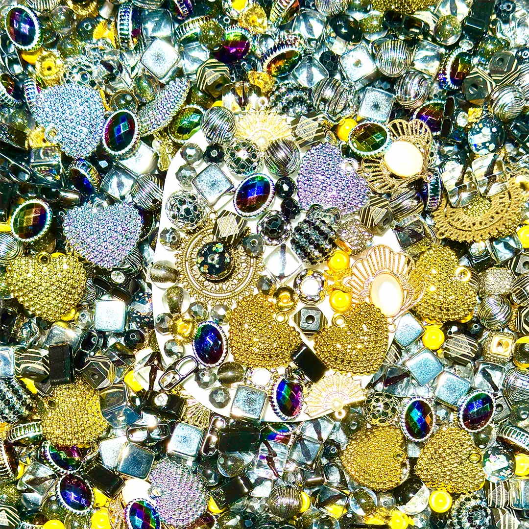 • Color: The main palette features a black-gold vintage color scheme, accented by bright yellow beads. It incorporates layered luster from glitter, iridescent pearl-like materials, presenting a luxurious vintage Art Deco texture overall.