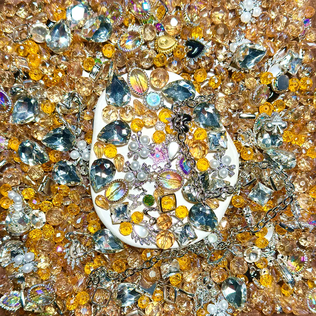 •Color: This bead mix centers on the "Glimmer Collector" theme, adopting a bright and dazzling color scheme dominated by iridescent clear glass, champagne gold, and soft silver. The iridescent glass beads reflect light from all angles, showing a dreamy gradient of rainbow colors, while the champagne gold and soft silver of the alloy add a warm metallic glow. Together, they create a brilliant and elegant visual atmosphere, perfectly interpreting the meaning of "collecting all glimmers" and highlighting the theme’s romantic and luxurious temperament.